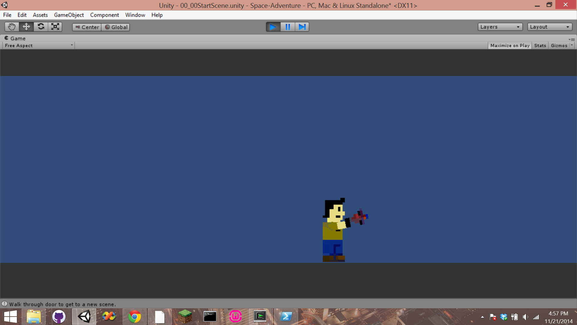 Space-Adventure (name not final) is a Super-Metroid style 2-d sidescroller with an emphasis on puzzle solving. We are building this game using the free version of Unity. Source code and other bits about the game can be viewed on github. Feel free to fork and contribute! Each team member was assigned certain developments of the game. They are: